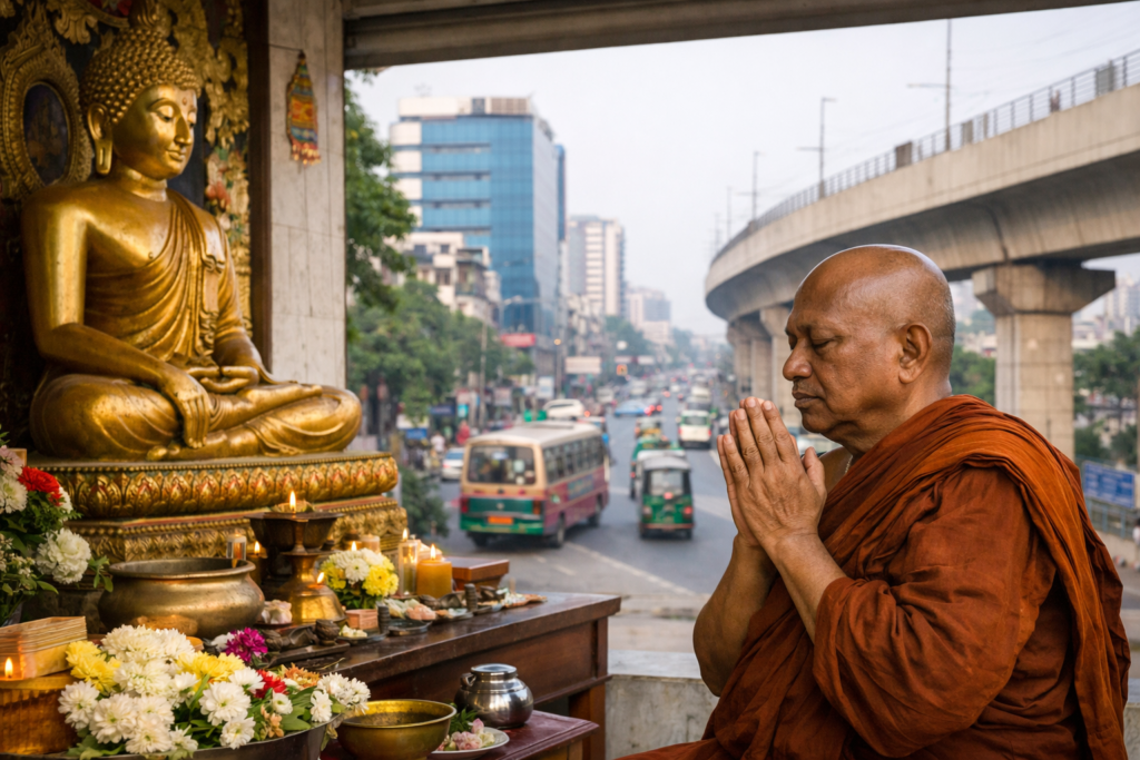 Located along Pragati Sarani, the lifeline of eastern Dhaka, the International Buddhist Monastery stands as a symbol of peace and harmony amid the bustling city. During a recent visit, the monastery’s Vice-Principal, Buddhananda Mahathero, offered prayers for national peace and unity.