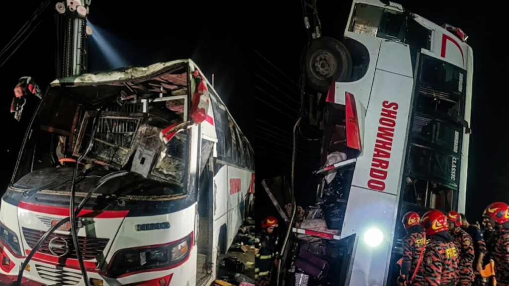 বাংলাদেশে আবারও এক হৃদয়বিদারক সড়ক দুর্ঘটনায় স্তব্ধ পুরো দেশ। ফেরিতে ওঠার সময় হঠাৎ নিয়ন্ত্রণ হারিয়ে একটি যাত্রীবাহী বাস সরাসরি নদীতে পড়ে যায়। এতে অন্তত ২৬ জনের মৃত্যু হয়েছে, যার মধ্যে ৫ জন শিশু রয়েছে।