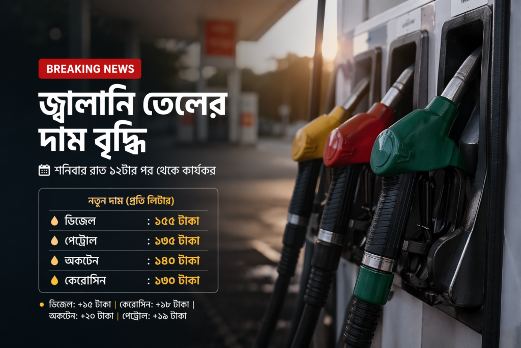 Thank you for reading this post, don't forget to subscribe!ভোক্তা পর্যায়ে সব ধরনের জ্বালানি তেলের দাম বৃদ্ধি করেছে সরকার। নতুন এই মূল্য শনিবার রাত ১২টার পর থেকে কার্যকর হবে বলে সংশ্লিষ্ট সূত্রে জানা গেছে।