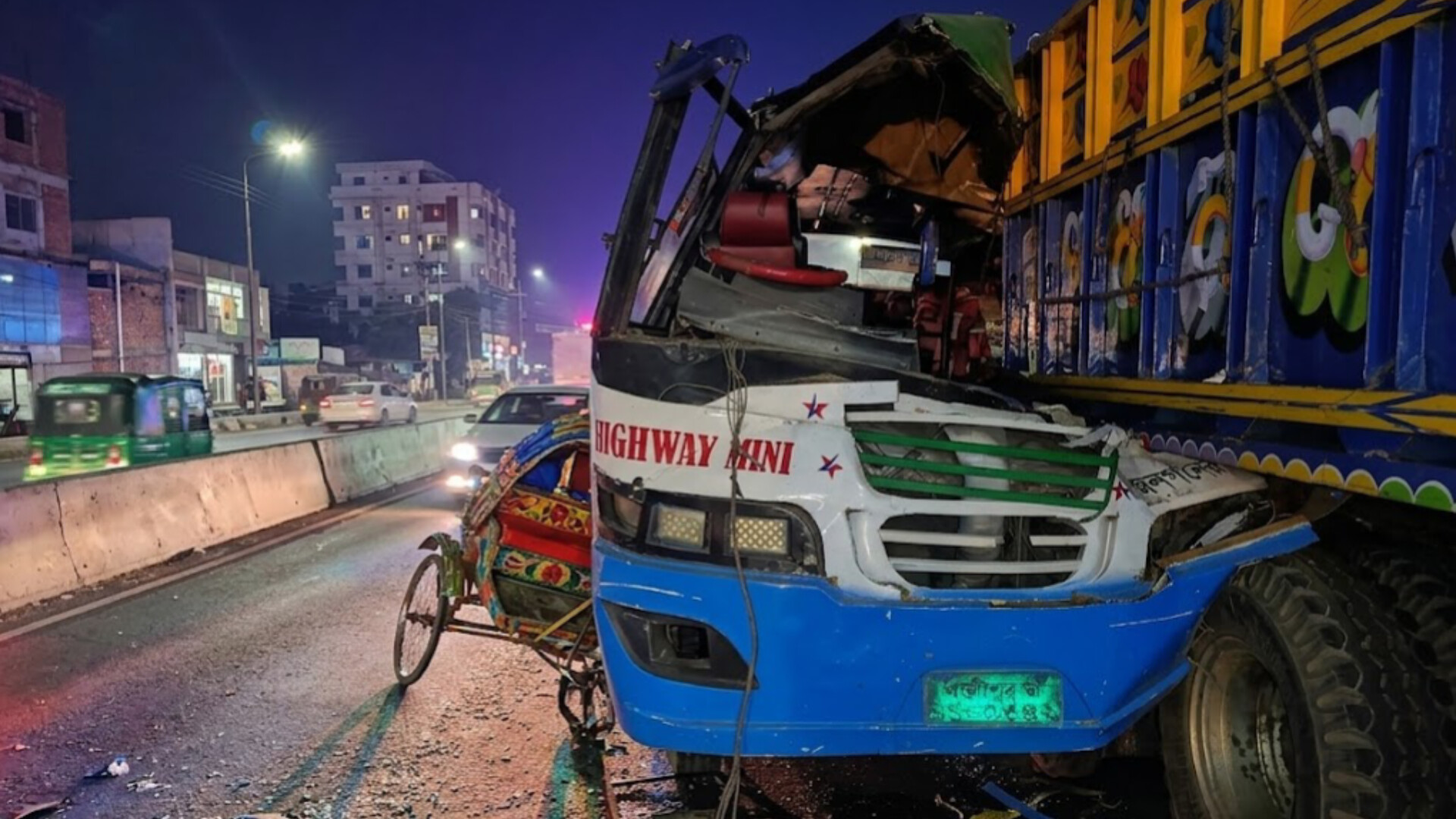 কোনাবাড়ী ফ্লাইওভারে বাস-ট্রাকের ভয়াবহ সংঘর্ষ — নিহত ৩, আহত অন্তত ১৫